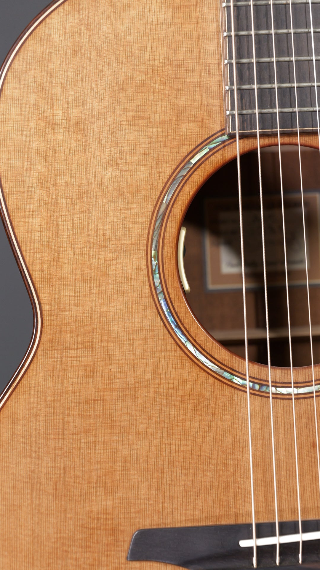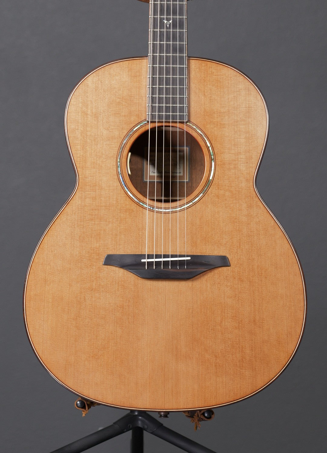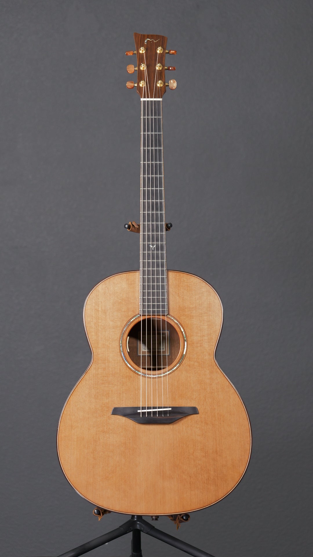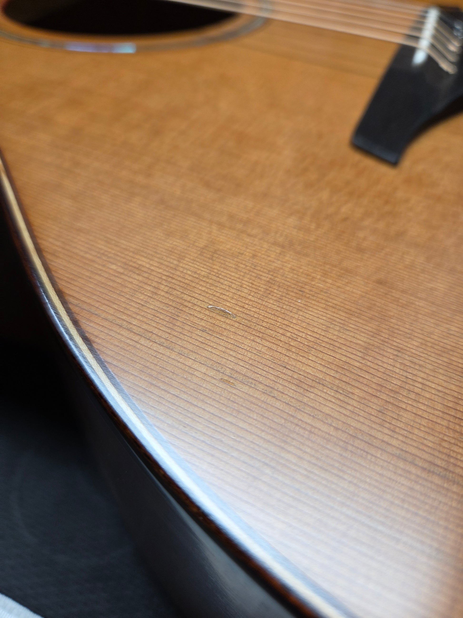 2016 McIlory A15 with a Western Red Cedar top and Brazilian Mahogany back and sides. The neck is a 5 piece Mahogany/maple/walnut build. There are very few blemishes. The last two photos show an indentation on the top and scratch. The back is mostly perfect. In just the correct angle you can see some surface scratches from muse. The tone is phenomenal and the jumps out at you when playing fingerstyle.